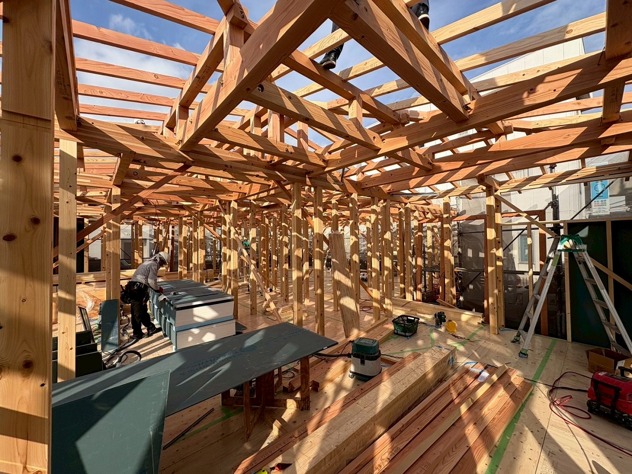 太い柱と梁がしっかりと組まれて、強固な建物の「骨格」が出来上がりました。
