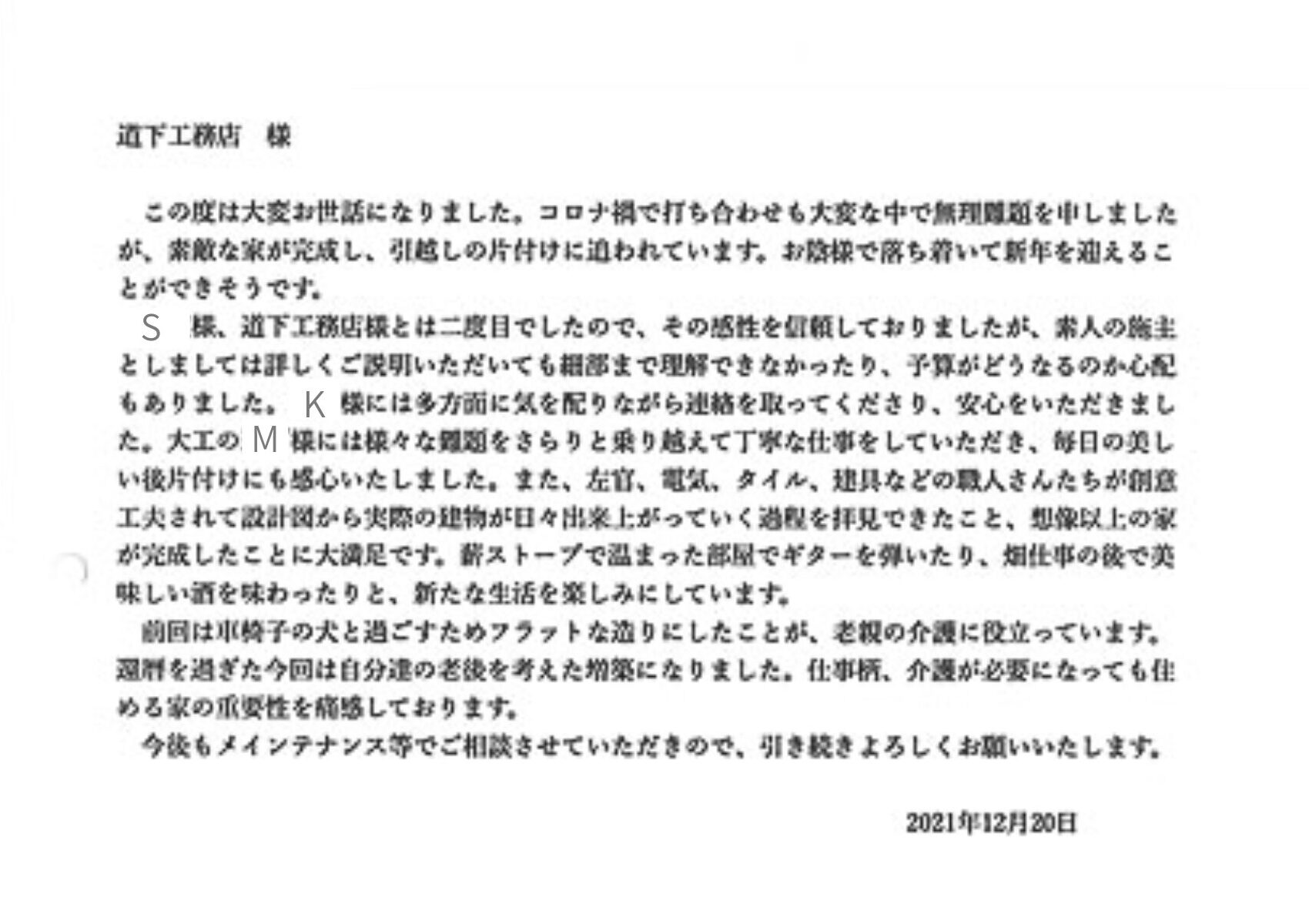 この度は大変お世話になりました。コロナ禍で打ち合わせも大変な中で無理難題を申しましたが、素敵な家が完成し、引越しの片付けに追われています。お陰様で落ち着いて新年を迎えることができそうです。