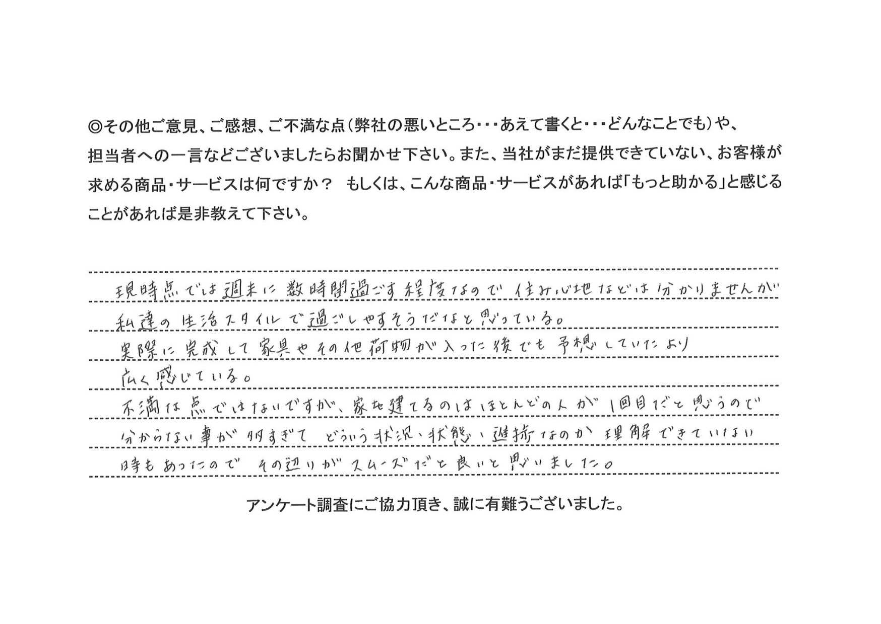 現時点では週末に数時間過ごす程度なので住み心地などは分かりませんが私たちの生活スタイルで過ごしやすそうだなと思っている。 実際に完成して家具やその他の荷物が入った後でも予想していたより広く感じている。不満な点ではないですが、家を建てるほとんどの人が1回目だと思うので分からないことが多すぎてどういう状況・状態・進捗なのか理解できていない時もあったのでその辺りがスムーズだといいと思いました。