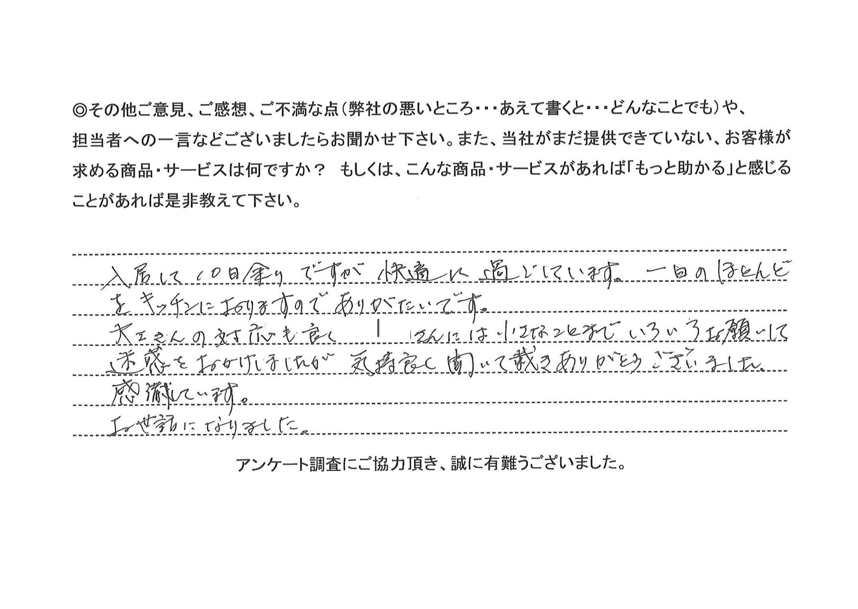 入居して10日余りですが快適に過ごしています。 一日のほとんどをキッチンにおりますのでありがたいです。 大工さんの対応も良くIさんには小さなことまでいろいろお願いして 迷惑をお掛けしましたが気持良く聞いて戴きありがとうございました。 感謝しています。お世話になりました。