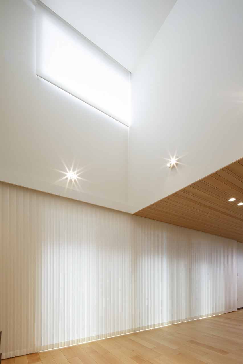 光の演出と廊下の奥行きがさらに広がりと開放感を与える玄関