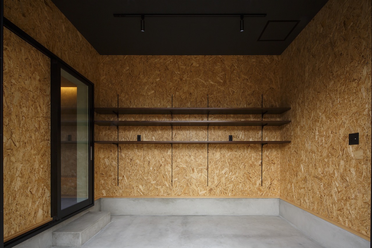 遊び心を詰め込む、OSB合板の隠れ家風ガレージ